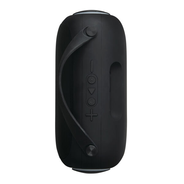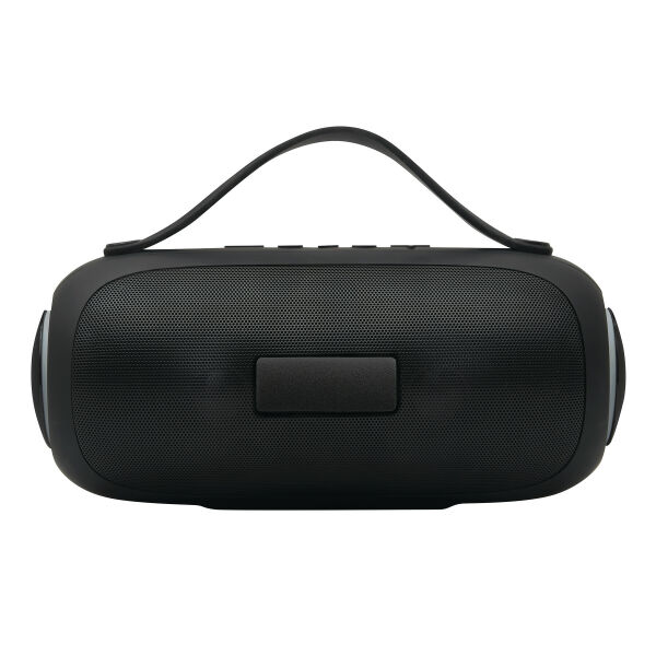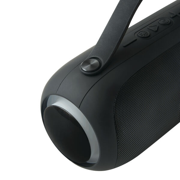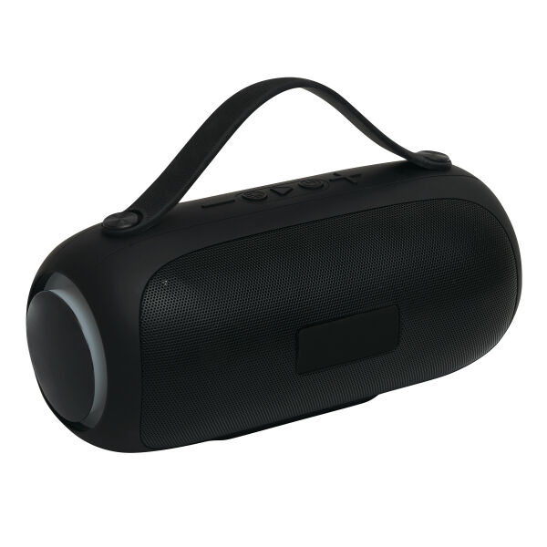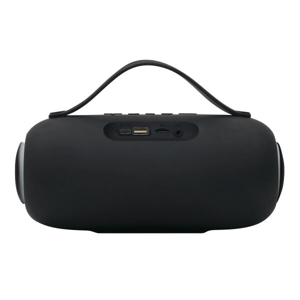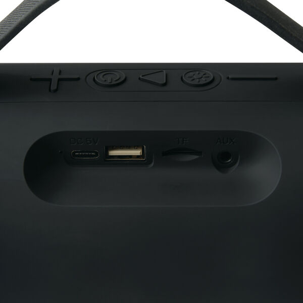 Draadloze luidspreker GIGA BOOM: met wisselende, gekleurde LED-verlichting aan de zijkanten, muziekvermogen 2x5 watt, te koppelen met smartphone, compatibel met Bluetooth®, ook aan te sluiten op externe apparaten via aux-ingang, MP3-functie via TF-kaartsleuf en USB-aansluiting, handsfree-functie, krachtige accu, capaciteit: 1.800 mAh, max. bereik: ca. 10 m, incl. USB-oplaadkabel (kabellengte ca. 50 cm, USB type C), incl. graveerplaatje met chromen onderlegger voor een gravure, zwarte siliconen handgreep, 2 antislipvoetjes, verpakt in een doos.